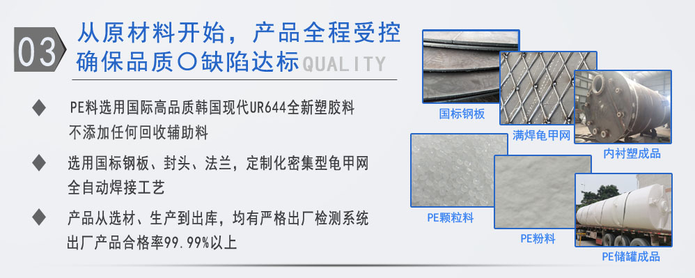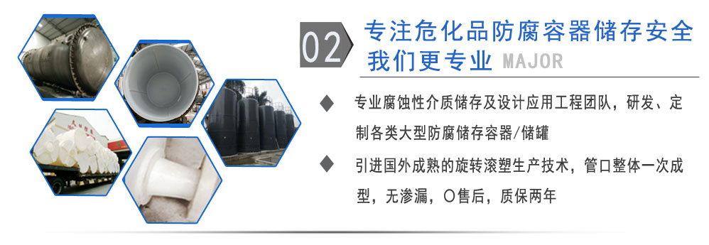 公司有鋼襯塑PE/PO、PE全塑、碳鋼、不銹鋼四大系列100多個品種,專注于常壓儲存容器生產,其產品包括鋼襯塑儲罐管口一體成型PE儲罐、碳鋼儲罐不銹鋼儲罐、反應釜、攪拌罐、離子交換柱、鋼襯PE/PO儲罐、塑料儲罐、鹽酸儲罐硫酸儲罐等等。更大限度滿足廣大客戶的各種需求,同時可以根據客戶的需要加工定制各種防腐設備。